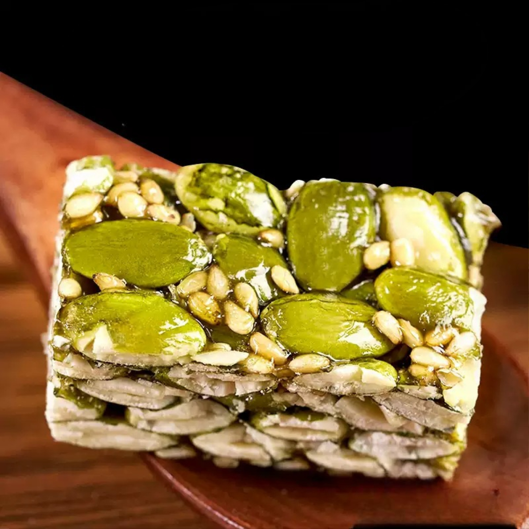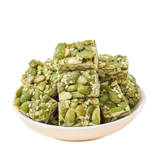 Hương Vị Đặc Trưng: Kẹo có vị ngọt thanh tự nhiên, không gắt, hòa quyện tuyệt vời với hương thơm bùi béo đặc trưng của hạt bí rang giòn.
